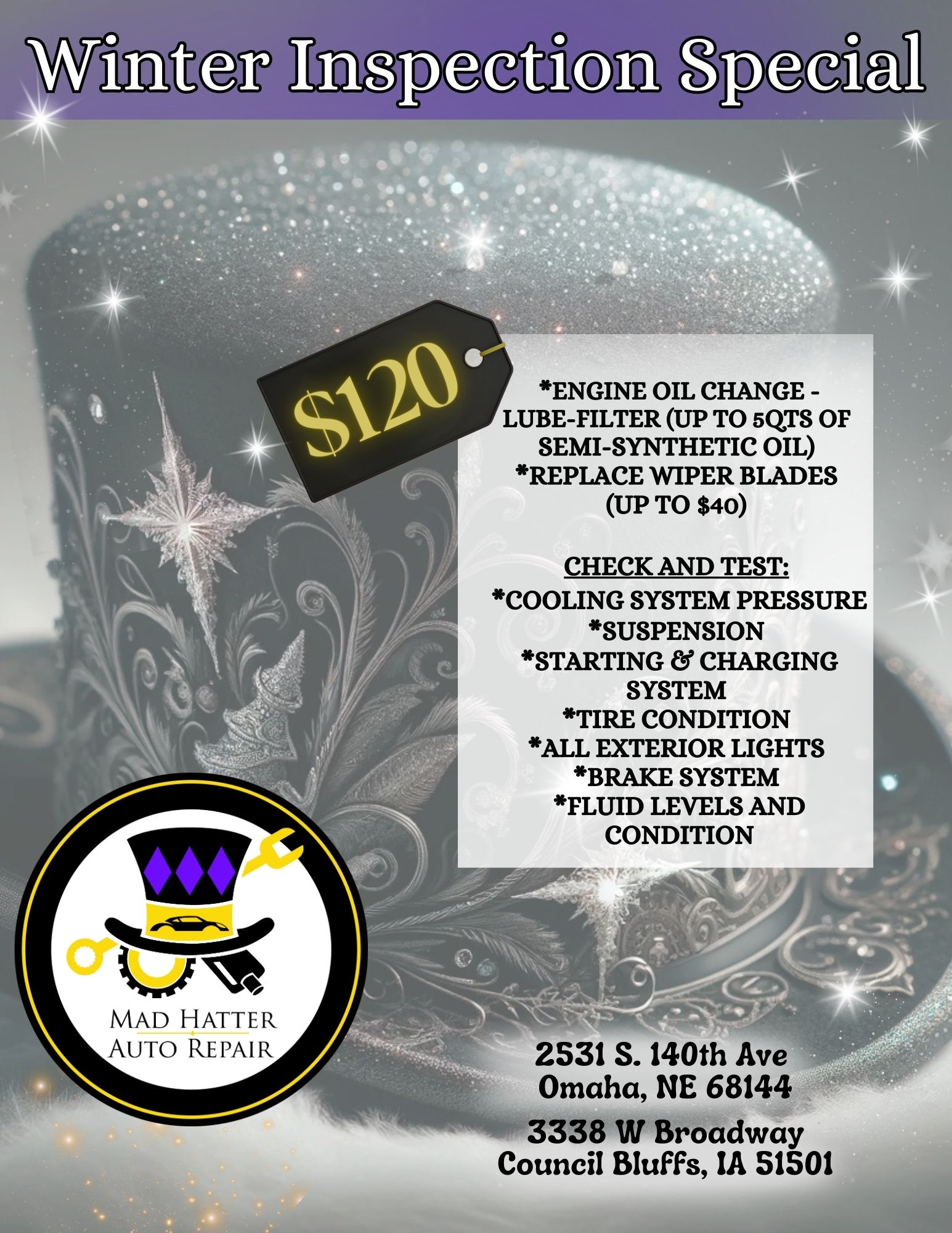Keep yourself and your loved ones safe on the wintery roads this season and as always, reach out to us with any questions you may have regarding your winter weather car prep. Our $120 winter inspection special is a great investment to assess where your car stands before the snow and ice start flying! In Omaha call (402) 330-2286 and in Council Bluffs call (712) 322-7500.